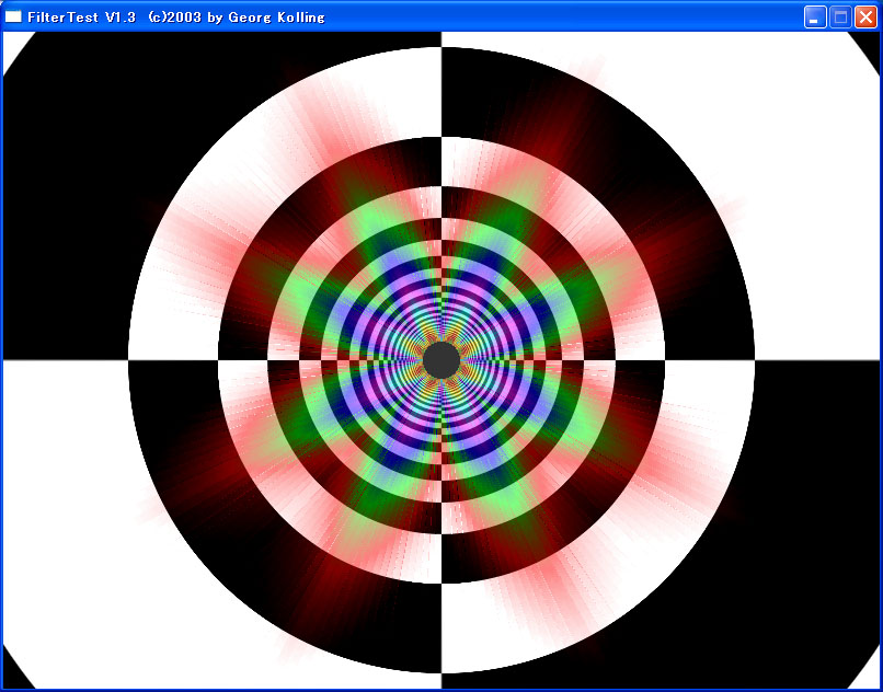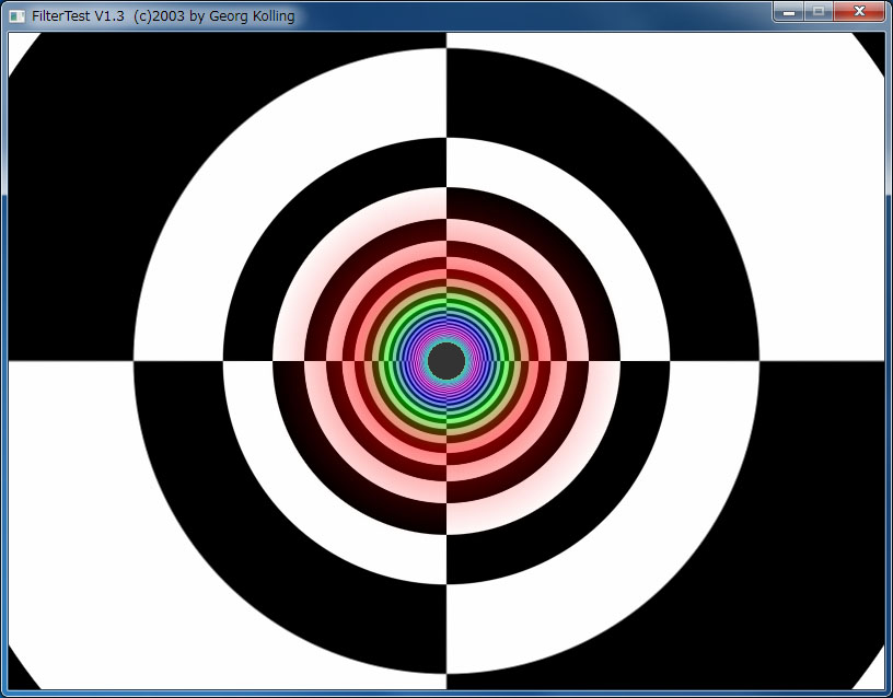 このテストプログラムは,MIPMAPの各縮小レベルを,あえて異なる単色で塗り潰したうえで,画面奥に向かって伸びるトンネルの壁に対して,異方性フィルタリングを適用しながらテクスチャ群をマッピングして(≒貼り付けて)いくというものである。