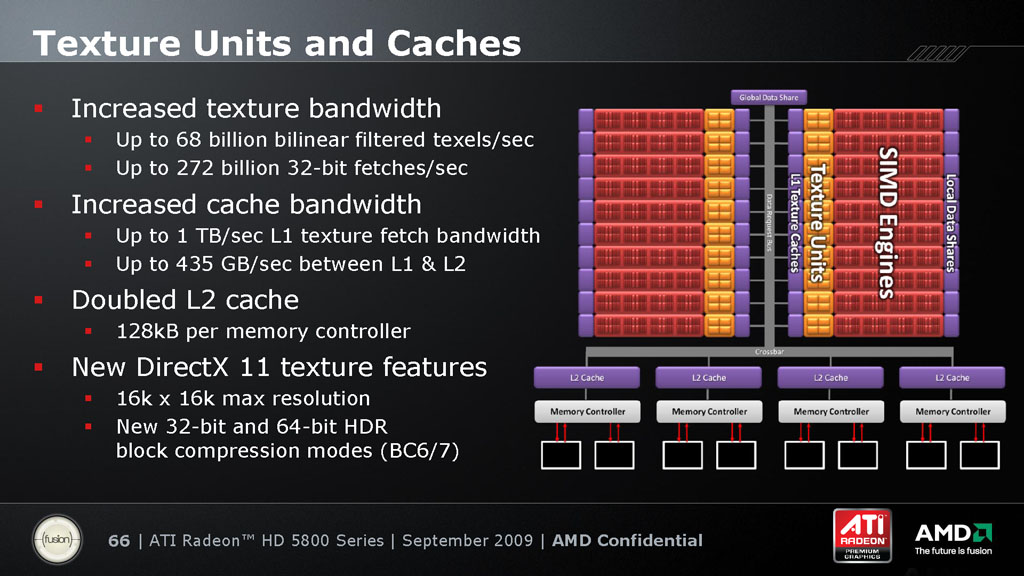 HD 5870を例に書き進めると,L1テクスチャキャッシュからSIMD Engineへの伝送帯域幅――すなわち,SIMD Engineの最大フェッチ速度――は毎秒1TBにまで高められたとのこと。HD 4870の同480GBと比べると,2倍以上だが,これはおそらく,L1キャッシュとSIMD Engineを結ぶバス帯域幅を2倍にしたことで実現されているのだろう。なお,L1テクスチャキャッシュの容量そのものは前世代と同じ8kBだと発表されている。