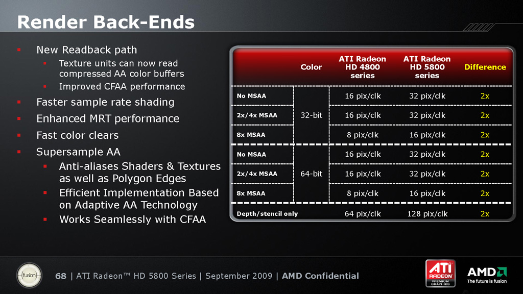 いずれにせよ,下の表を見ると分かるように,スペック的にはHD 4870比で2倍のピクセルスループットを達成できている。