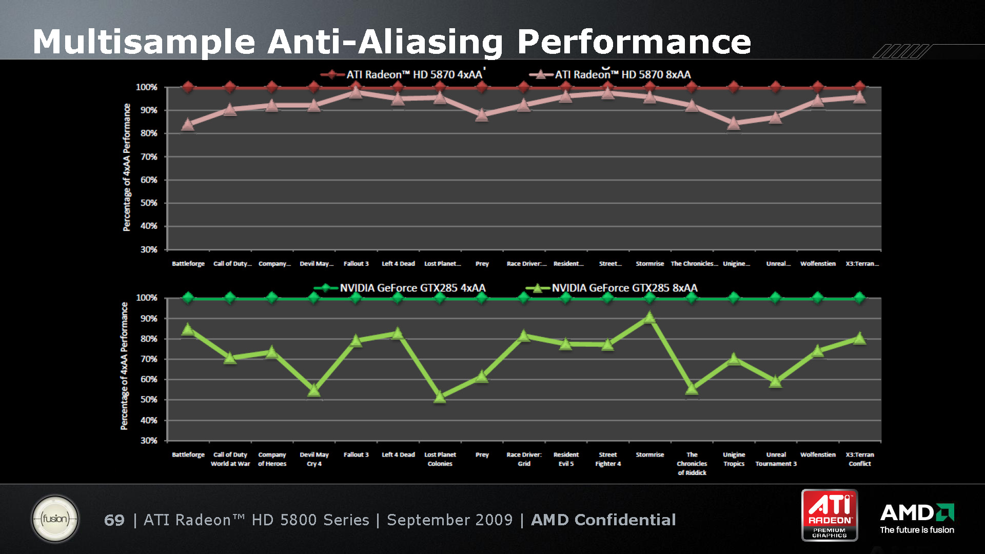 このグラフは,4x MSAA適用時のパフォーマンスを100%として,8x MSAA適用時のパフォーマンス低下率を表したものだ。上がHD 5870,下がNVIDIAの「GeForce GTX 285」だが,HD 5870のほうが,8x MSAA適用時のパフォーマンス低下率が大きくないことを見て取れる。