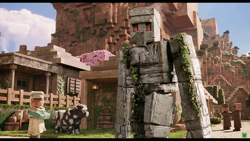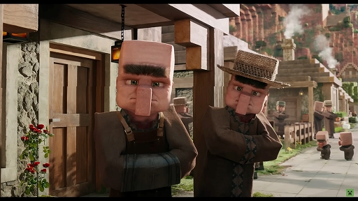 また,動画には,映画の初公開シーンも収録されており,登場人物たちが初めて村を訪れる様子とともに,奇妙な見た目の村人たちや商人,巨大なアイアンゴーレムなど,実写風に落とし込まれたゲームのキャラクターたちを確認できる。