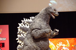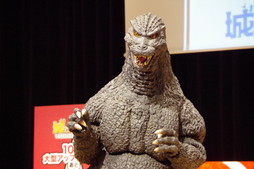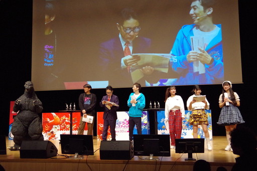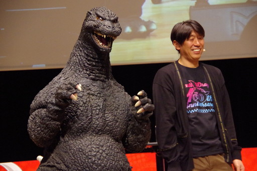 ゴジラもステージに出現。精巧に作られた着ぐるみに圧倒されつつ,さねしげ氏は「小顔ですね。意外と(笑)」と感想を語り,加藤Dは「頑張れたと思うんですけど」と笑顔を見せながらゴジラと身長を比べて会場を沸かせた。