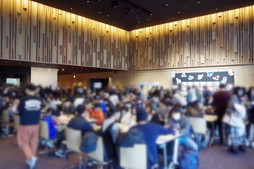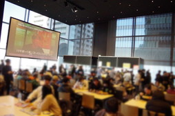 ホールには来場者がお祝いを寄せたメッセージボードに加えて,大会の当日予選用テーブルがズラリ。ホールの中心に配置された複数のテーブルを囲むように席が設けられ,参加者は適度に休めるようになっていた。