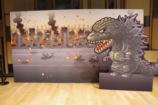 ホールにはコラボビジュアルを用いたフォトスポットが設営され,来場者はゴジラと一緒に記念撮影を楽しめた。グリーティングには整理券が必要だったが,フォトスポットは多くの子どもたちで賑わっていた。