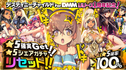 PC版「デスティニーチャイルド For DMM」のリリース1周年を記念し、★5チャイルド1体を必ず獲得できる「ドキドキ!★5シェアガチャ」の受け取り回数がリセットとなりました。
