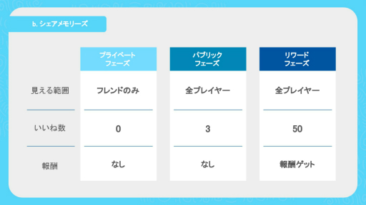 この機能によって,プレイヤーは自ずとフレンドやほかのプレイヤーから「いいね」をもらえるようなメモリーを残すようになるというわけである。