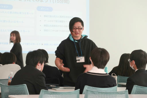 授業の後半では,生徒たちが3〜5人のグループに分かれて,言葉を使わずにコミュニケーションを取るための新たな感情表現を考えるワークショップが行われた。中には「電車ごっこ」や「円陣」といった,ゲーム内で盛り上がりそうなものもあり,生徒たちの柔軟なアイデアに感心させられた。