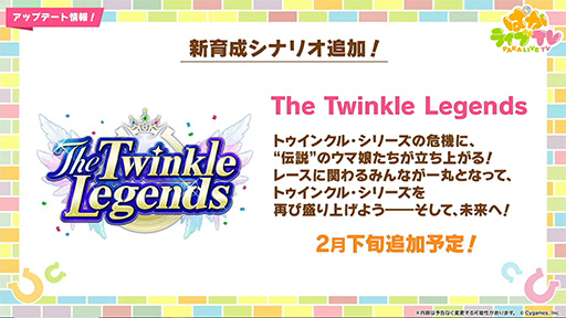 まず,直近の大きなニュースといえば,やはり新育成シナリオ「The Twinkle Legends」の話でしょう。1月29日に配信された公式番組「ぱかライブTV Vol.49」で,そのキービジュアルが公開されました。