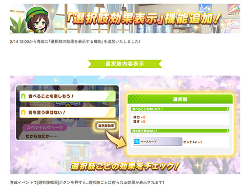 これまでは,育成イベントの選択肢が出るたびに効果を調べる,もしくは覚えておかないといけませんでしたが,この機能の追加によって今後わざわざそういった手間をかけなくても良くなりました。覚えていない選択肢が出るたびに調べていた筆者を含むトレーナーにとっては,嬉しすぎる機能といえます。