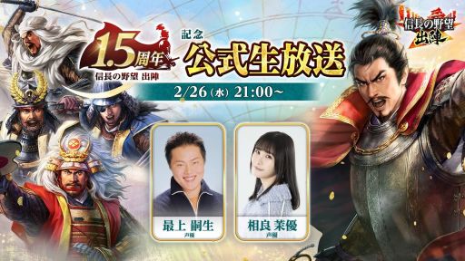 位置情報ゲーム「信長の野望 出陣」(iOS/Android)の1.5周年を記念した公式生番組が,2月26日21:00から配信される。