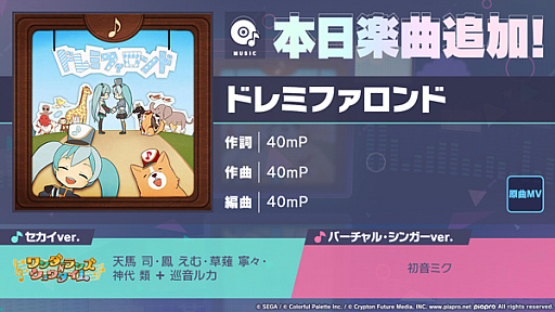「ドレミファロンド」(作詞・作曲:40mP)を、『プロジェクトセカイ』の新たなリズムゲーム楽曲として追加いたしました。