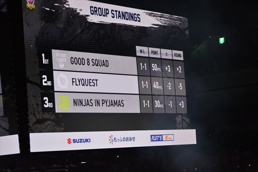総当たりで実施されたグループリーグを突破したのは,日本のGood 8 Squadと北米のFlyQuest。Good 8 Squadは,FlyQuestには惜敗するものの,Ninjas In Pyjamasを無敗の3連勝で下し,1位通過となった。なお,勝敗数の関係でFlyQuestが2位抜けとなったが,終わってみれば全チームが1勝1敗で並ぶ拮抗した戦いだった。