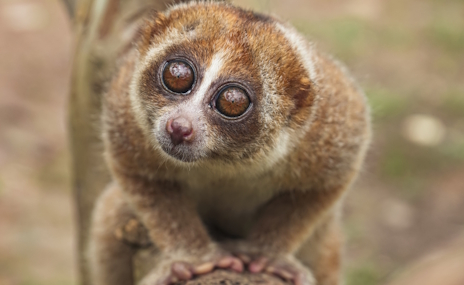 やあ,僕はスローロリス。木の上でゆっくりと動くからこの名前が付いたらしい。霊長類の中でも一番キュートな僕だけど,実はこうみえて毒を持ってるんだ。