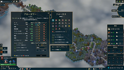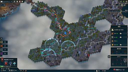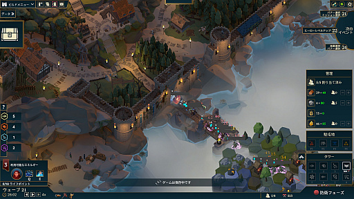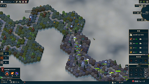 ゲームは「エコノミーフェーズ」と「防衛フェーズ」に分かれている。エコノミーフェーズでは町の建設や作業者の配置などの内政を行い,防衛フェーズでは敵の攻撃を防ぐ。このリズムがとても心地よく,まるで木の枝から枝へと慎重に移動するときのように,バランスを取りながら進めていく感覚が楽しい。