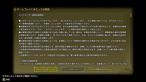 しかし,新作というのは買って起動してゲームをはじめるまでの時間に異様な興奮作用をもたらす。一秒でも早く操作したいとき,長ったらしいうえ,なにが書かれてんのかよく分かんないテキストにじっくりと目をとおすなんてこと,死にゲー以上に難度が高い。