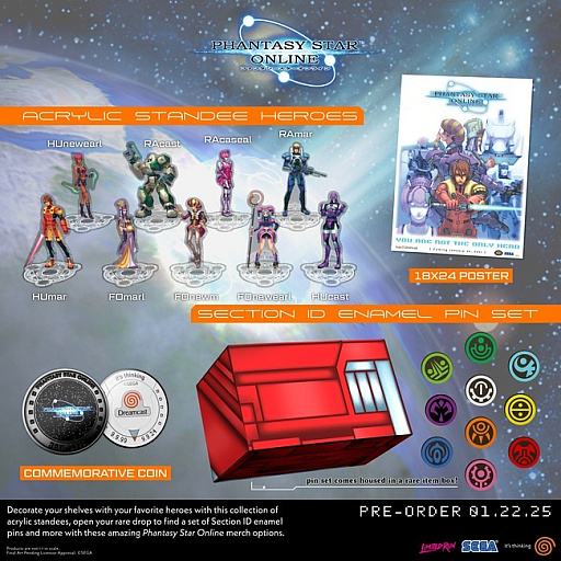 初代「PSO」新作公式グッズの予約受付中。セクションIDのピンバッジが赤箱に入ったファン感涙の品など,さまざまなアイテムが揃う